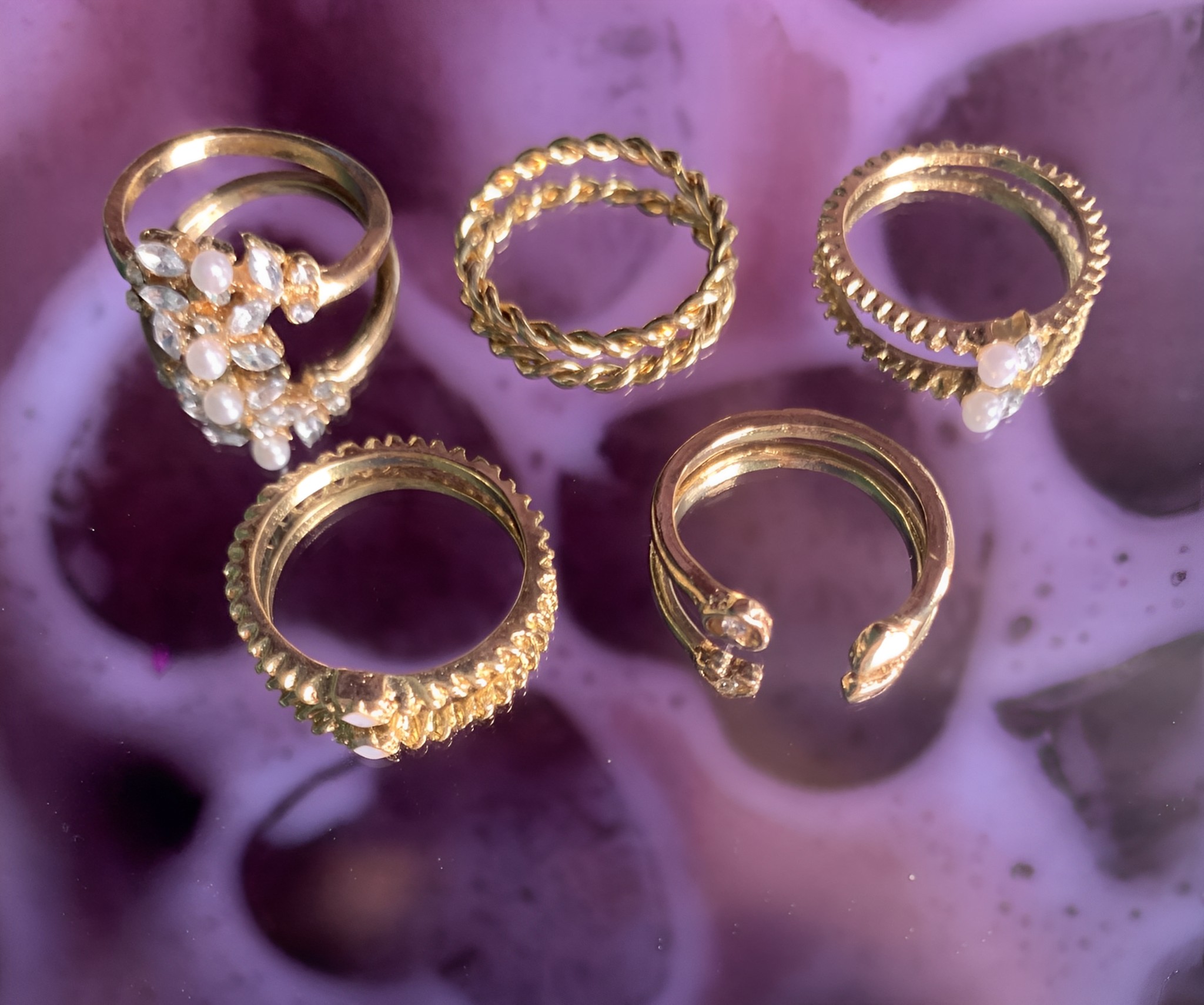 ¡Luce delicada y femenina con estos preciosos anillos florales! Chapados en oro, cada uno está adornado con pequeñas piedras y perlas que imitan pétalos y centros, perfectos para cualquier ocasión especial.