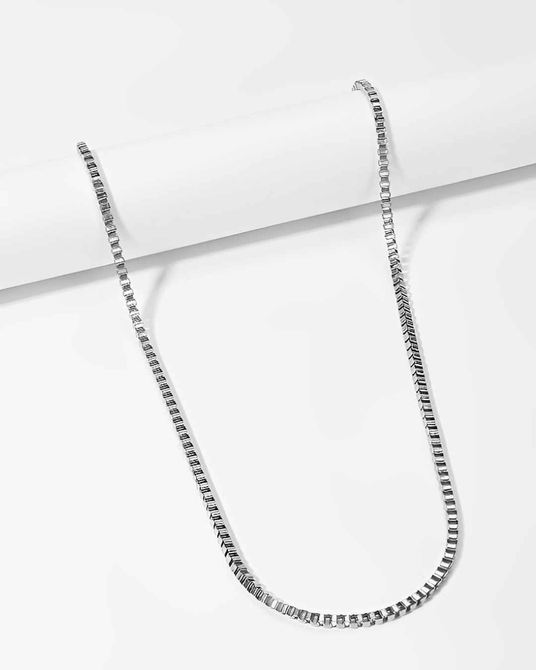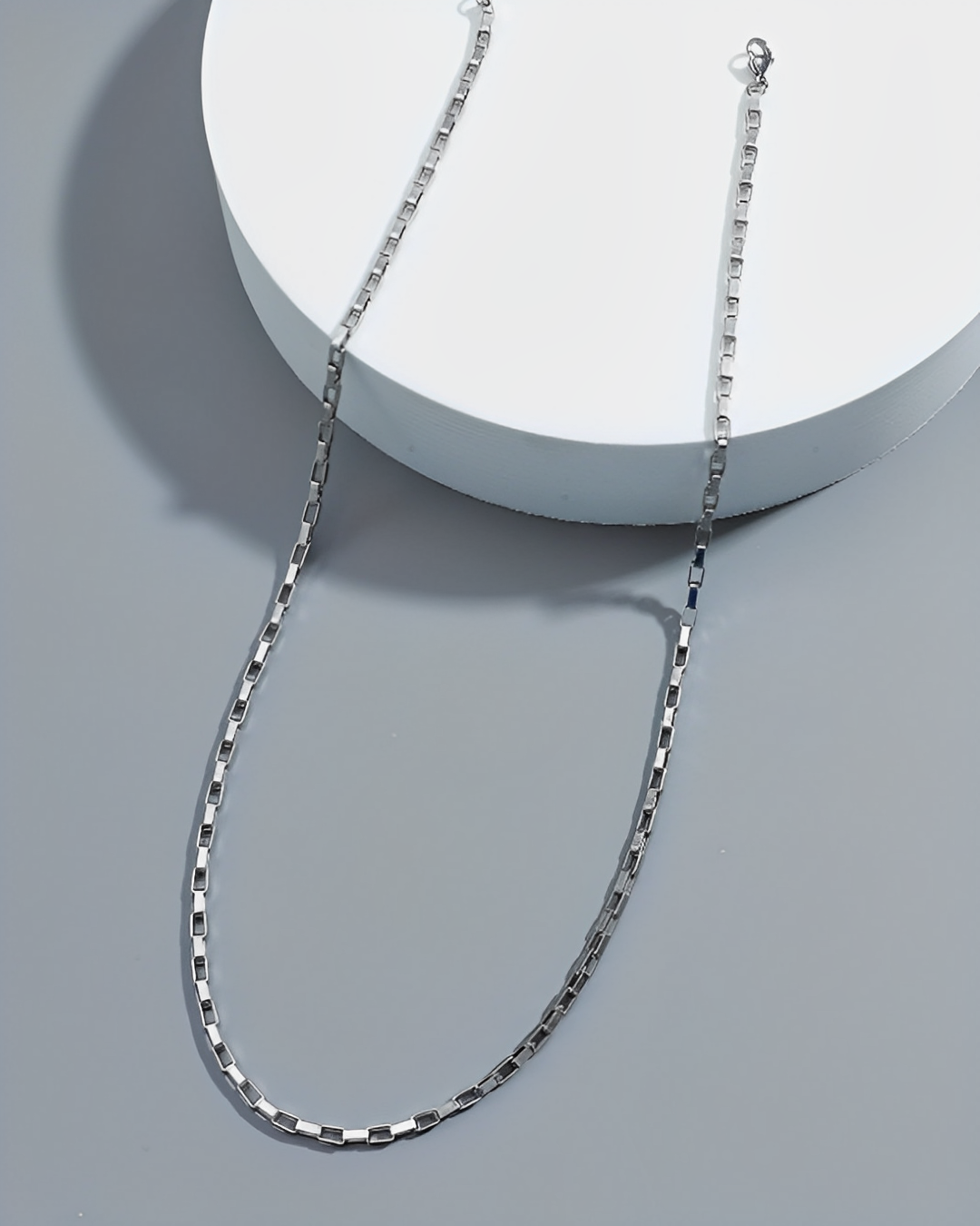 Dale un toque moderno y elegante a tu look con esta cadena de acero inoxidable. Su diseño de eslabones cuadrados y su acabado brillante la convierten en un accesorio versátil y resistente, perfecto para cualquier ocasión.