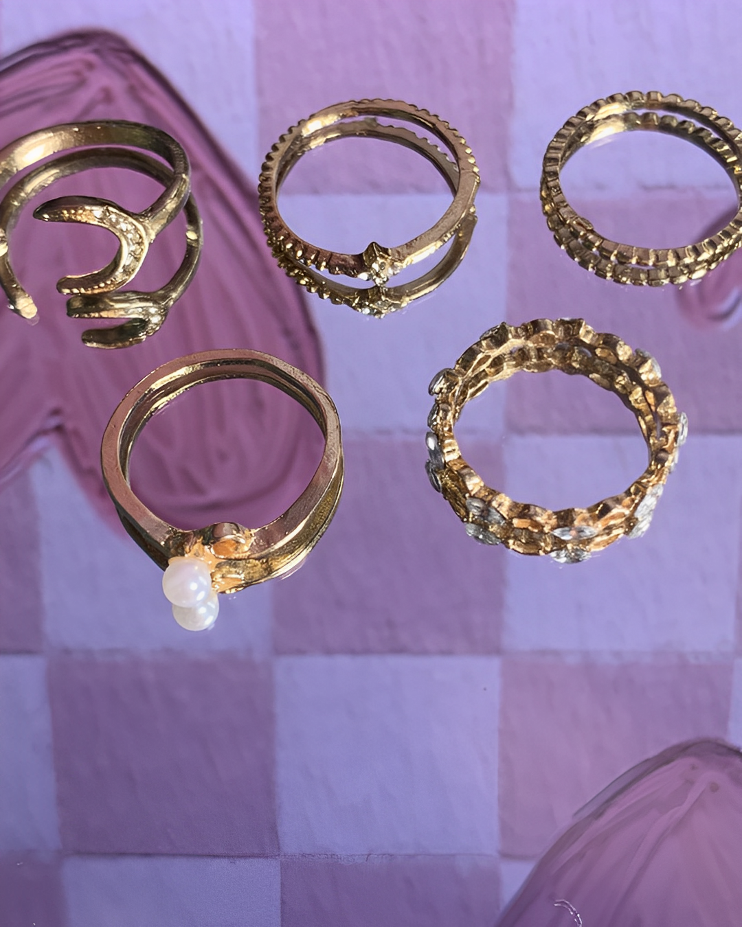 ¡Haz brillar tu estilo con estos anillos deslumbrantes! Elaborados con una base chapada en oro, cada pieza cuenta con detalles de perlas sintéticas y cristales que reflejan la luz de forma encantadora. Ideales para complementar tus outfits más sofisticados.