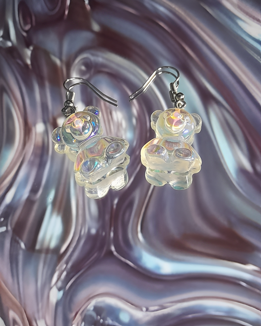 ¡Añade diversión y color a tu estilo con estos encantadores aretes! Fabricados en resina iridiscente, los ositos reflejan la luz en tonos mágicos, mientras que sus ganchos de acero inoxidable aseguran comodidad y durabilidad.