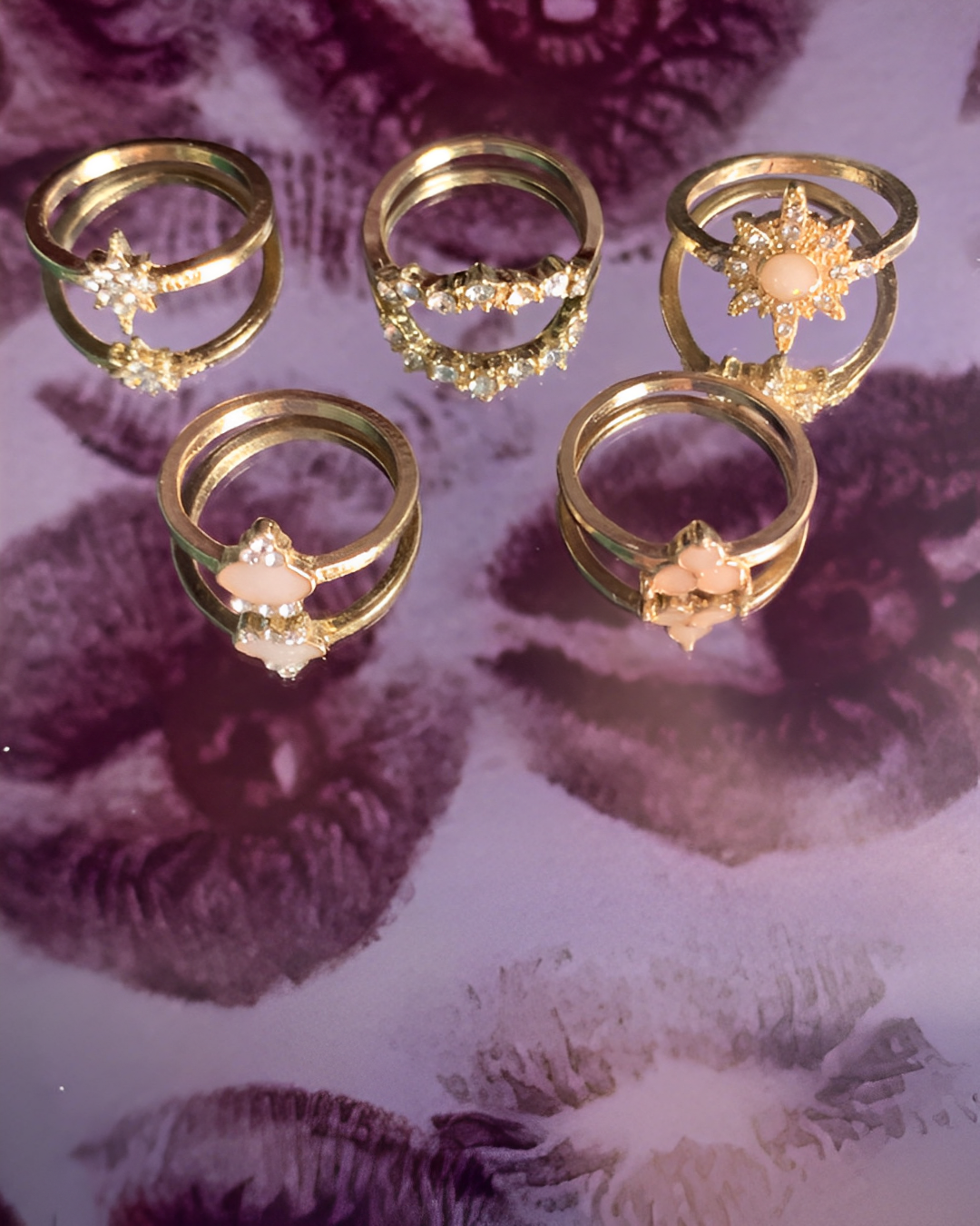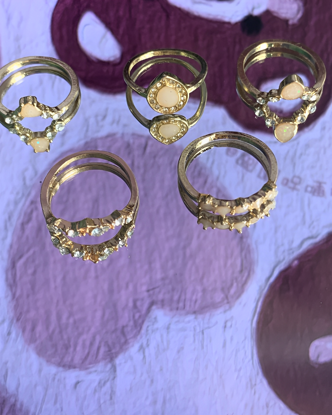 ¡Añade un toque mágico a tu look con estos hermosos anillos! Cada pieza chapada en oro incluye piedras tipo ópalo que reflejan la luz en tonos suaves y encantadores. Perfectos para resaltar tu elegancia.