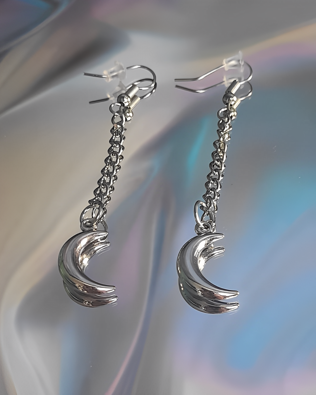 Dale un toque místico y moderno a tu estilo con estos aretes colgantes. Fabricados en acero inoxidable, su diseño de lunas brillantes es ideal para un look nocturno lleno de sofisticación.