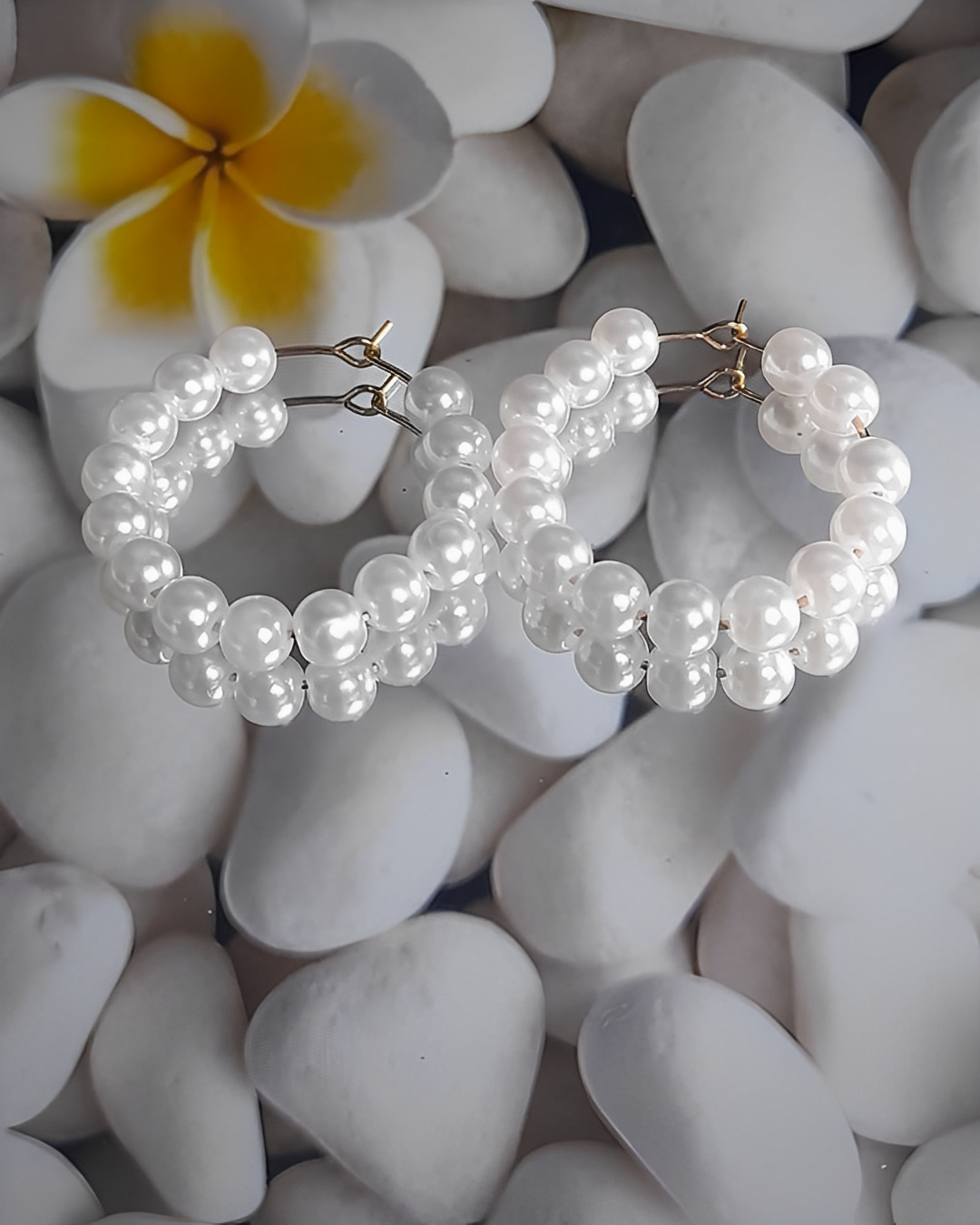 ¡Luce clásica y sofisticada con estos aretes llenos de encanto! Compuestos por aros dorados decorados con perlas sintéticas brillantes, son el accesorio perfecto para darle un toque refinado a cualquier atuendo.